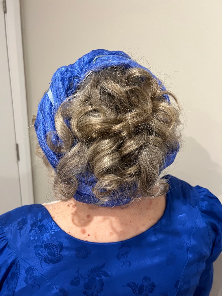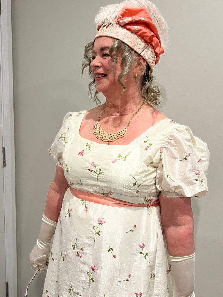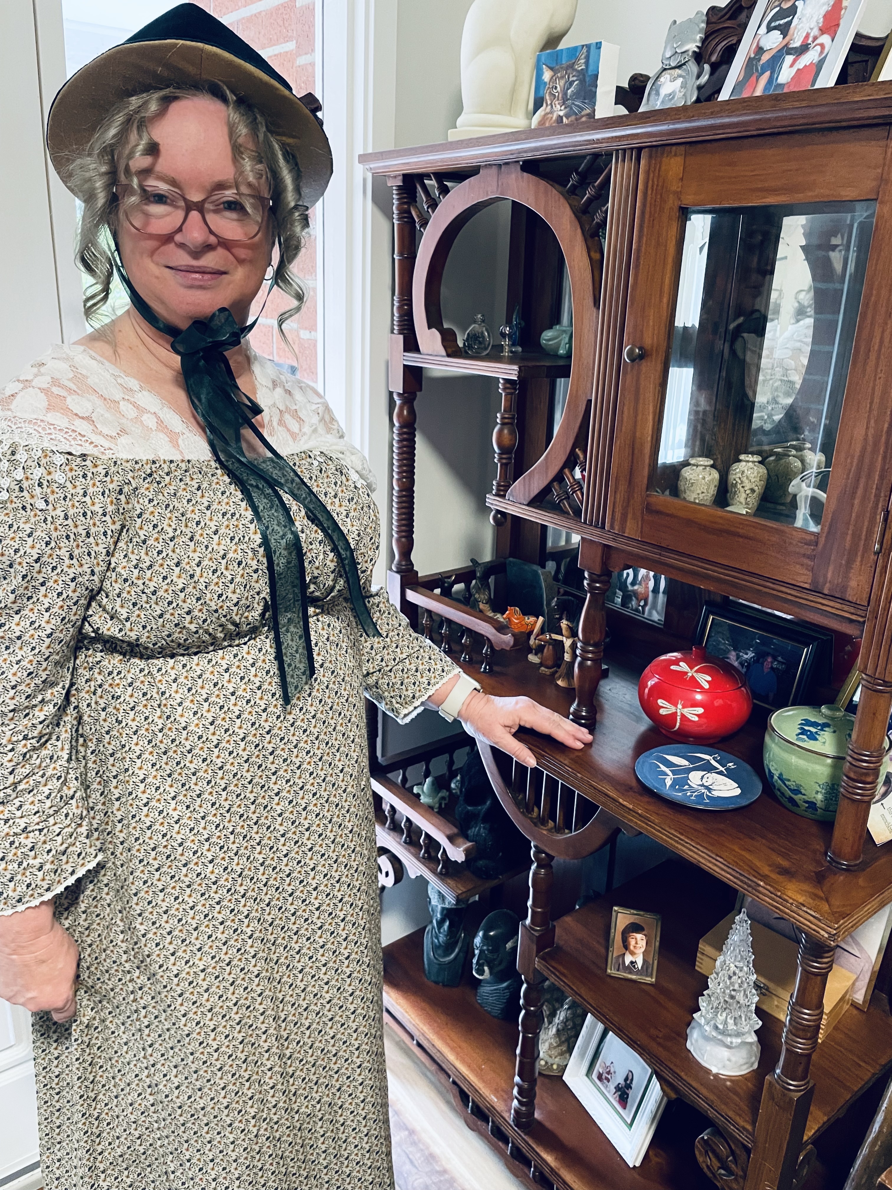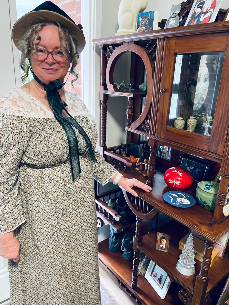 This dress was an adaption of the plaid dress patter. I had less fabric to work with so bought the Apricot satin for contrast and bustle. It is a lighter dress for the heat and the bustle is not as overly engineered.