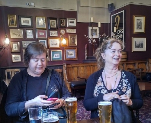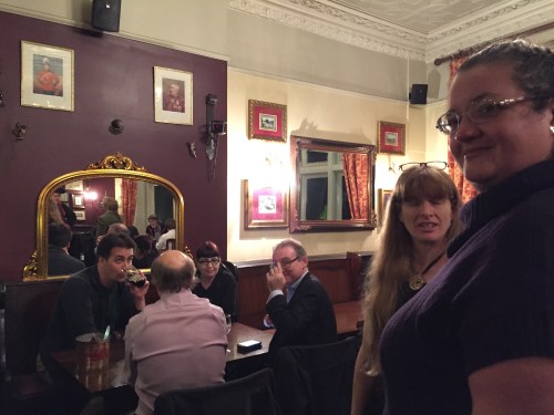 I wasn’t meant to be meeting there but Patrick’s plans to be in Ireland were tossed on the scrap heap. I met more people, like Nicholas who sounds like Liam Neeson and others but I can’t remember everyone’s name. I had a meal of bangers and mash. The bangers were pork, apple, mustard and were very nice. Here is a pic of me and Fiona Moore.