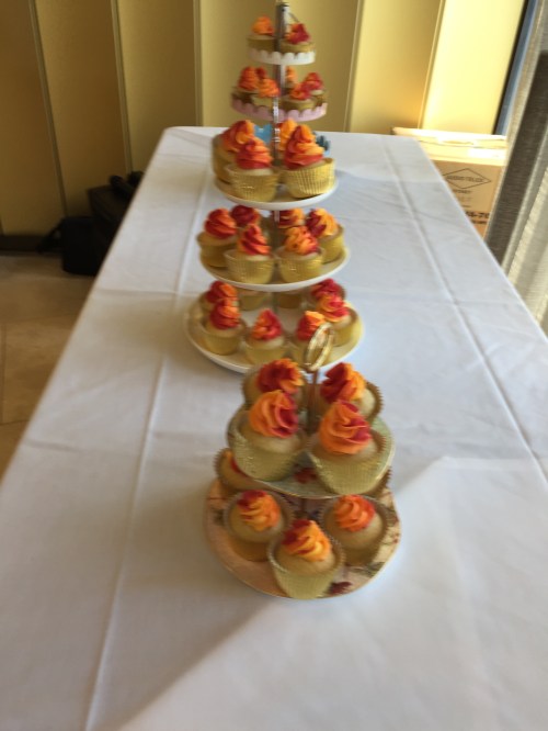 Then it was a short break while I set up for my book launch. As I was away in Bourke, I couldn’t bake so I paid for someone to bake some cupcakes for me. I asked Leife Shallcross who she had do her cupcakes for her launch because they were amazing. There was only a week so not much time to do something too fancy. Listya made vanilla cupcakes with lemon butter filling and butter icing swirls in red and yellow to give the impression of flames, you know dragon flames. They were stunning to look at and drop dead yummy. I ate two of them. I also had bubbly, dips and nibbles and quiches. As it was the last two books in the Dragon Wine series, I was celebrating as well as launching. Many of the people in the audience were people who helped me along the way. I was touched by their support and with friends coming from outside the convention to be at the launch.