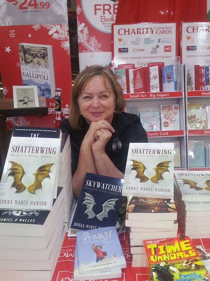 Donna-dragonAnd to finish a shot of me signing again. A great photo by Cat Sparks. I am very grateful to Cat for reading and launching Shatterwing. I know she is very busy with her PhD and writing so I appreciate it, heaps. Many thanks to  Nicole Murphy for MCing and being a great support. Hugs to Russell and Kylie for making the launch. And Keri Arthur and Tracey O’Hara! Thank you to my Canberra Speculative  Fiction Guild buddies. Thank you to those of you who attended who were too many to name. I really am humbled by your support.